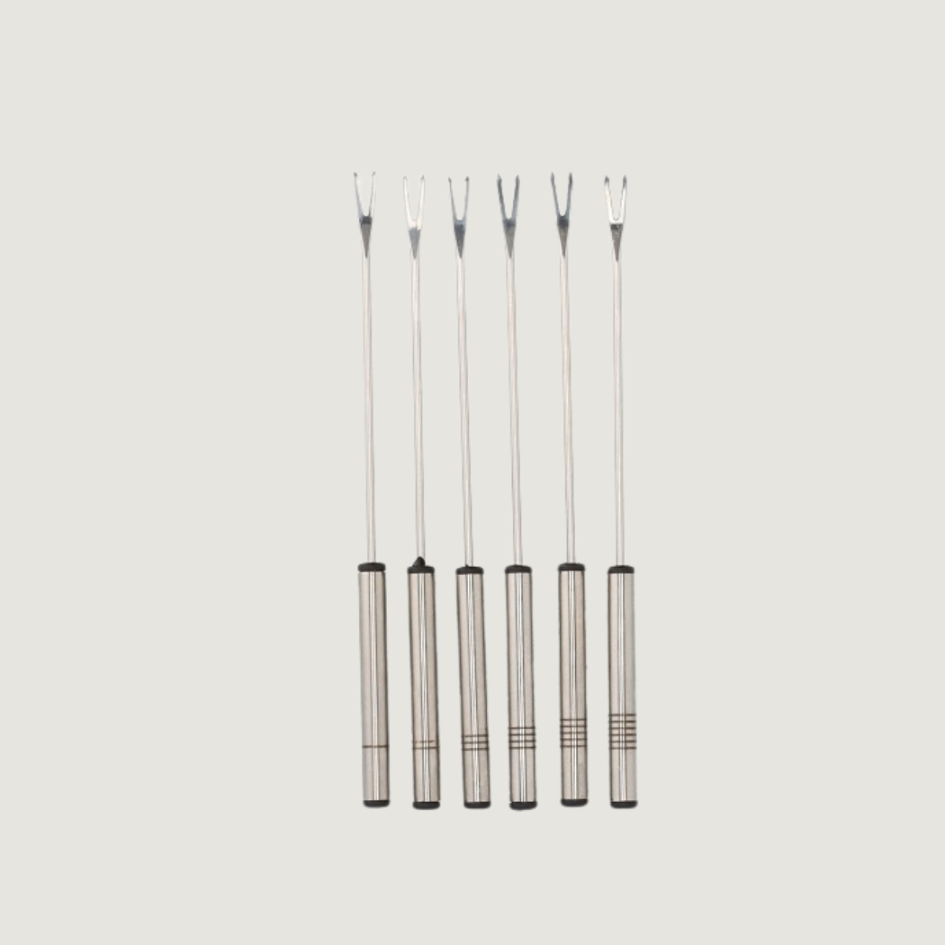 • Fonduegryta, sidhandtag och gaffelhållare i rostfritt stål