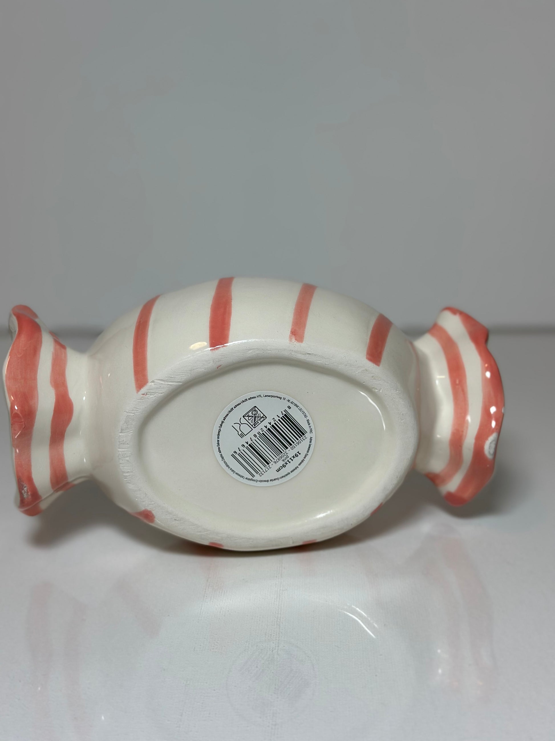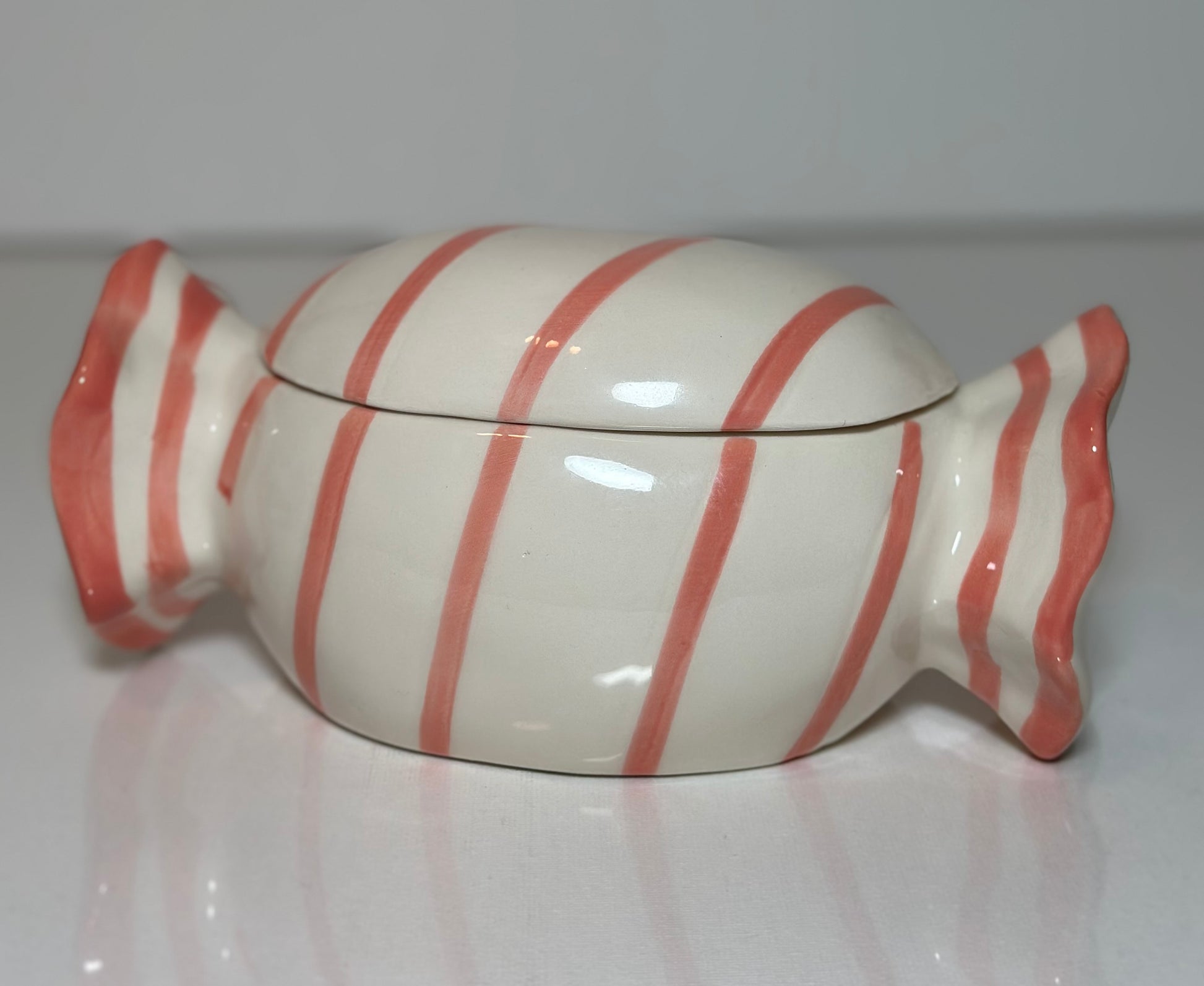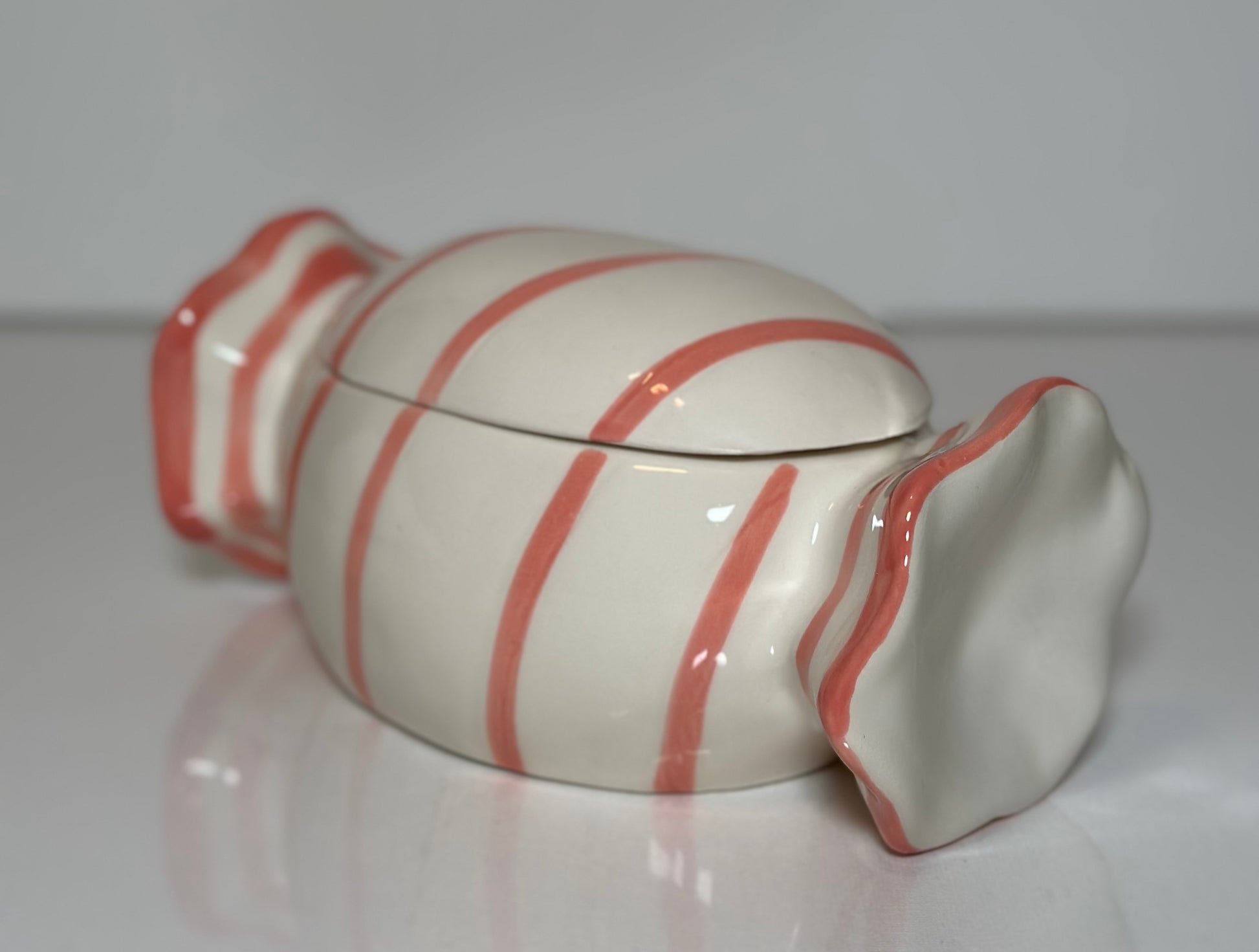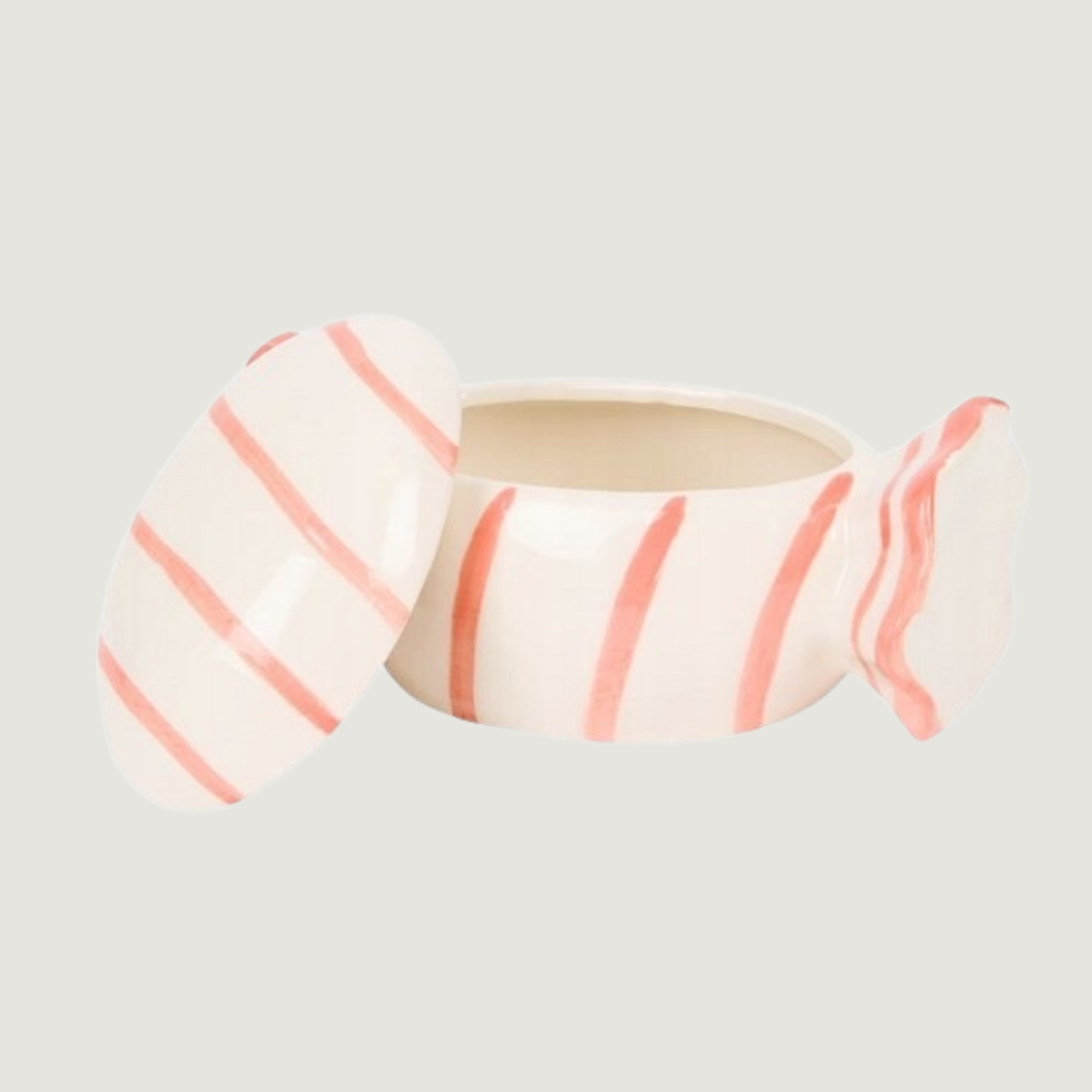 Dekorativ och funktionell keramisk burk i form av en karamell.