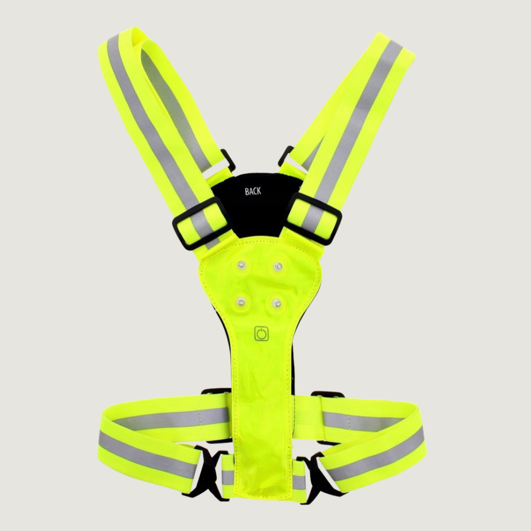 Den justerbara passformen gör att västen passar de flesta, medan neonfärg och reflexband ökar synligheten. Inbyggda LED-lampor fram och bak ger extra säkerhet och kan användas med fast eller blinkande ljus.
