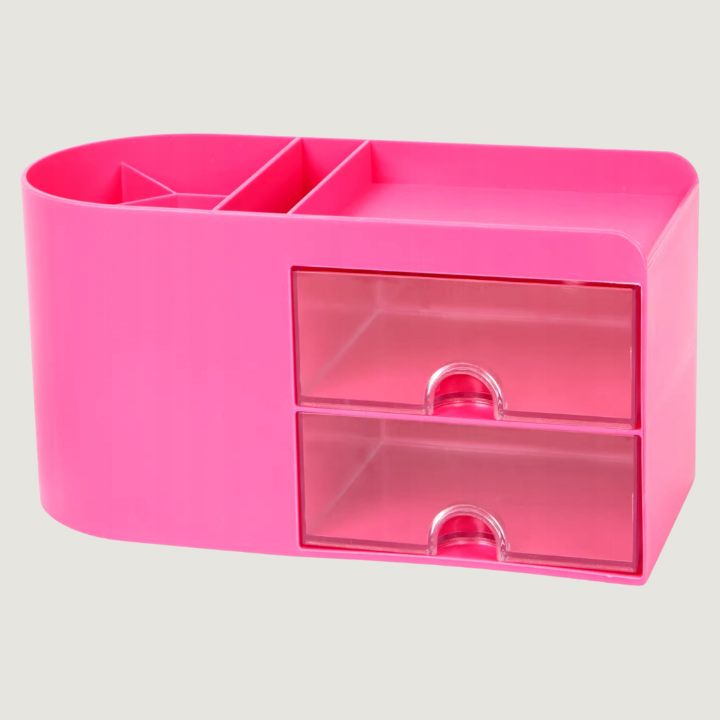 Praktiskt skrivbordsställ som hjälper dig att hålla ordning på skrivbordet. Passar för förvaring av småsaker och kontorsmaterial. Utrustad med flera fack samt två transparenta lådor.