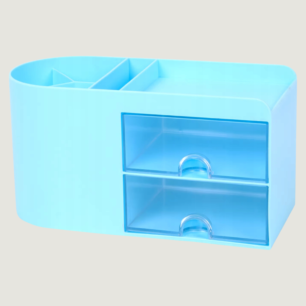 Praktiskt skrivbordsställ som hjälper dig att hålla ordning på skrivbordet. Passar för förvaring av småsaker och kontorsmaterial. Utrustad med flera fack samt två transparenta lådor.