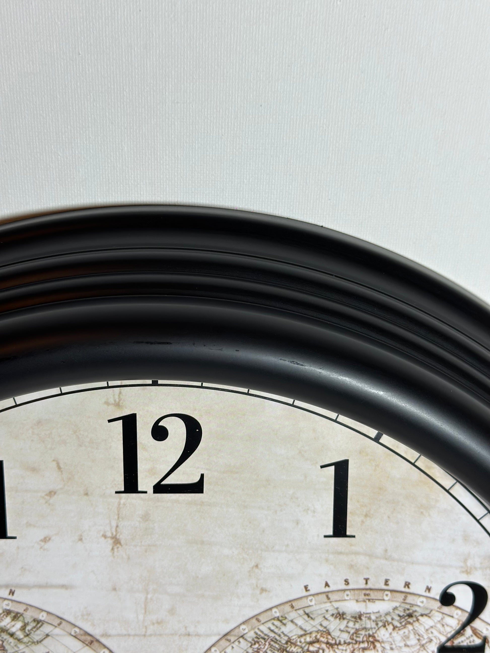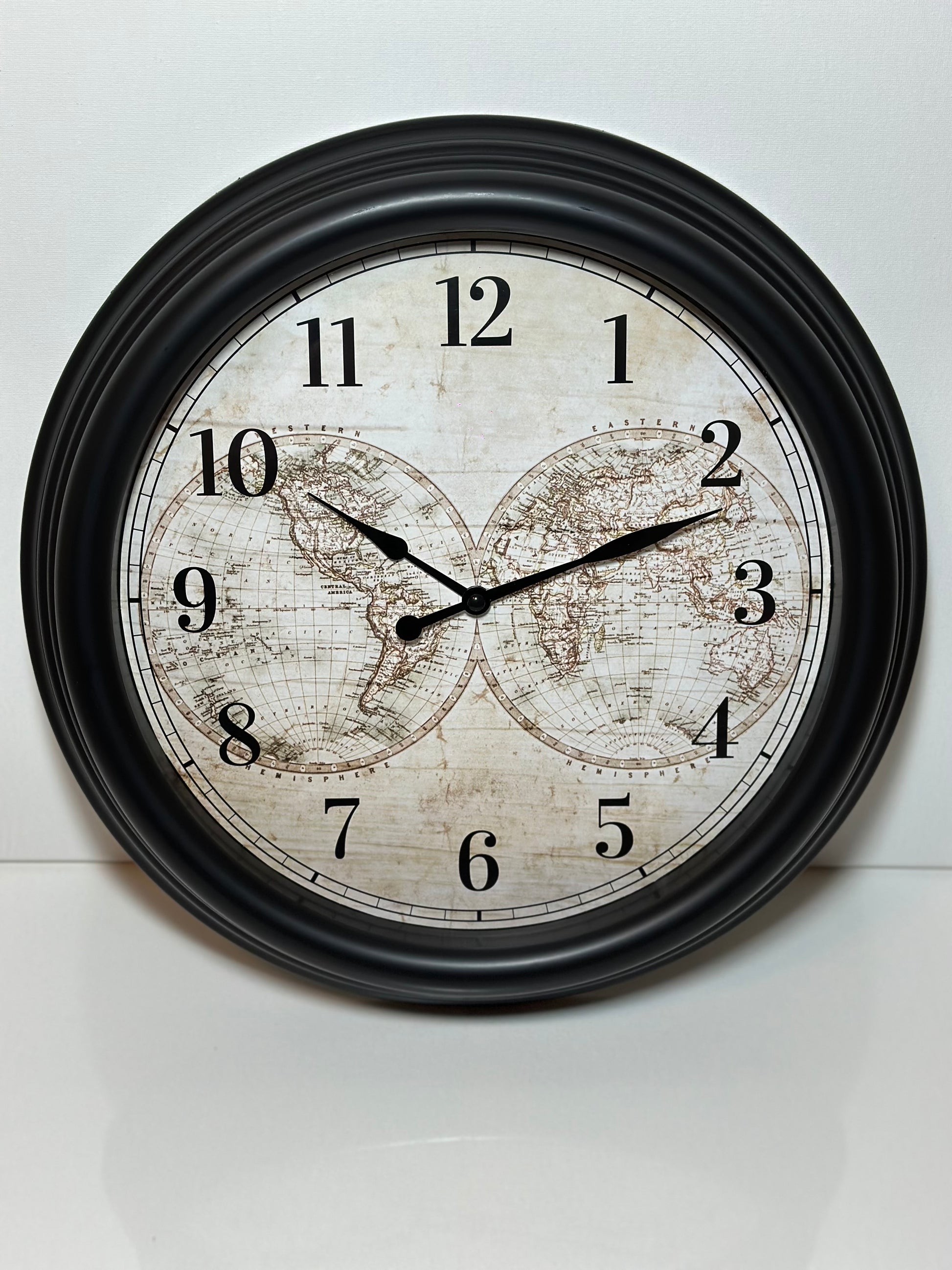 Snygg väggklocka med en stilfull urtavla prydd med en världskarta i klassisk vintage-design.
